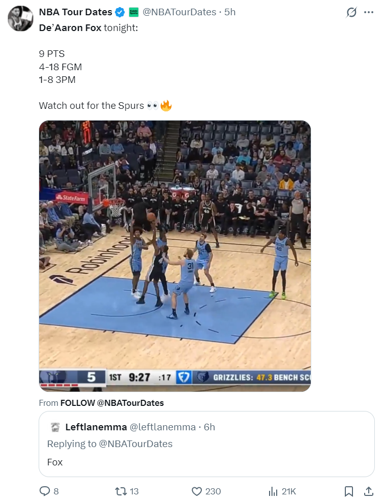 在这场比赛之前,福克斯刚刚接受了Scoop B的专访,福克斯表示在马刺这支充满后场球员的球队打球最主要的是做自己,在防守端也要有组织者的心态,会帮助哈珀更快的适应NBA的节奏。【结果福克斯就是用18中4来做自己】